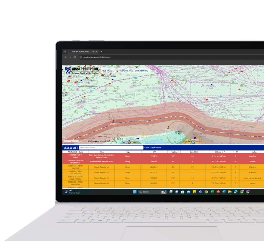 A web-based monitoring system integrated with AIS receiver stations is designed to monitor vessel traffic to prevent potential hazards around assets located undersea. Assets can be submarine cables, gas & pipelines, marine zones and ports.